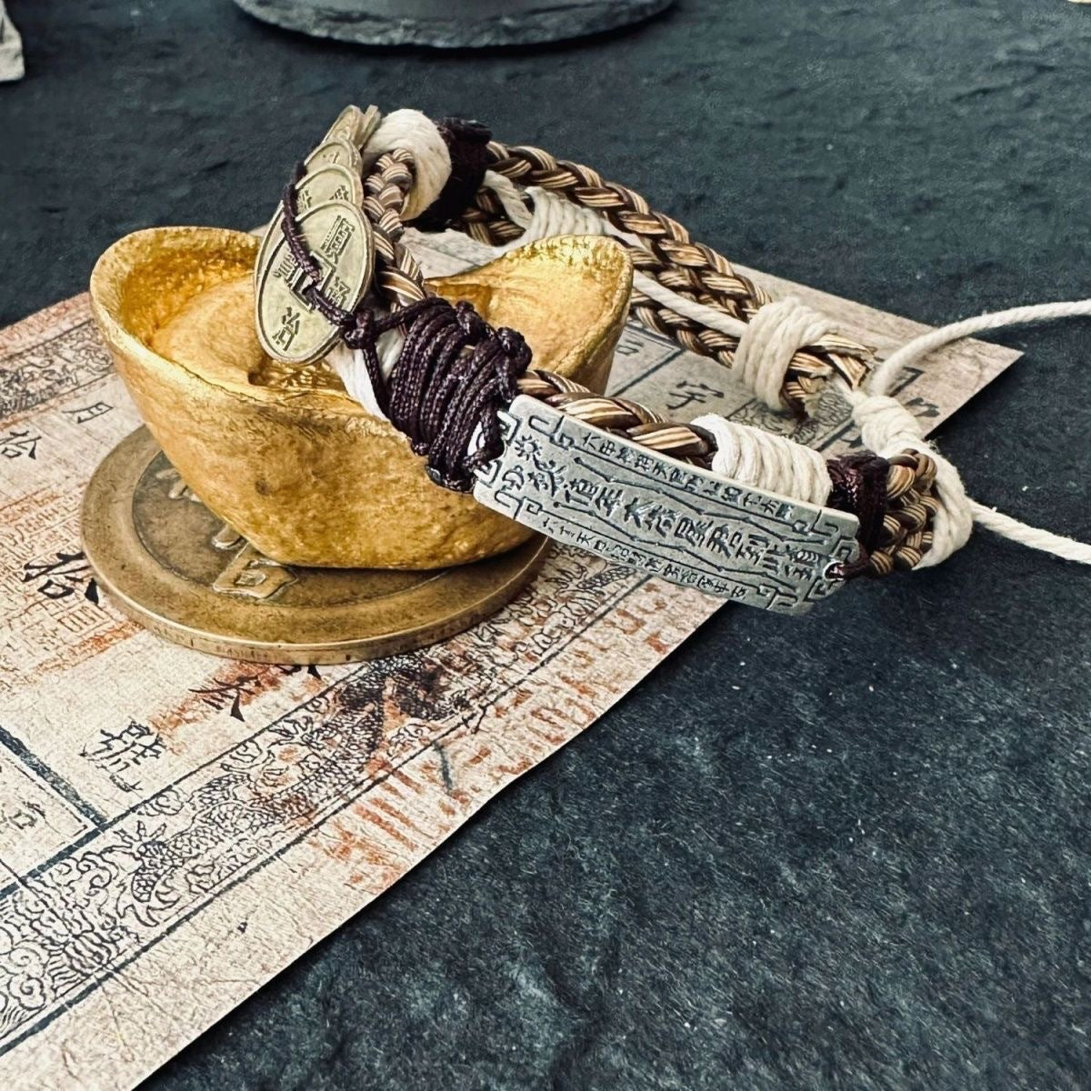 Braided cords form the base, paired with twisted metal strands and a row of ancient-style coins and a charm plate, giving the piece a solid, protective presence on the wrist.