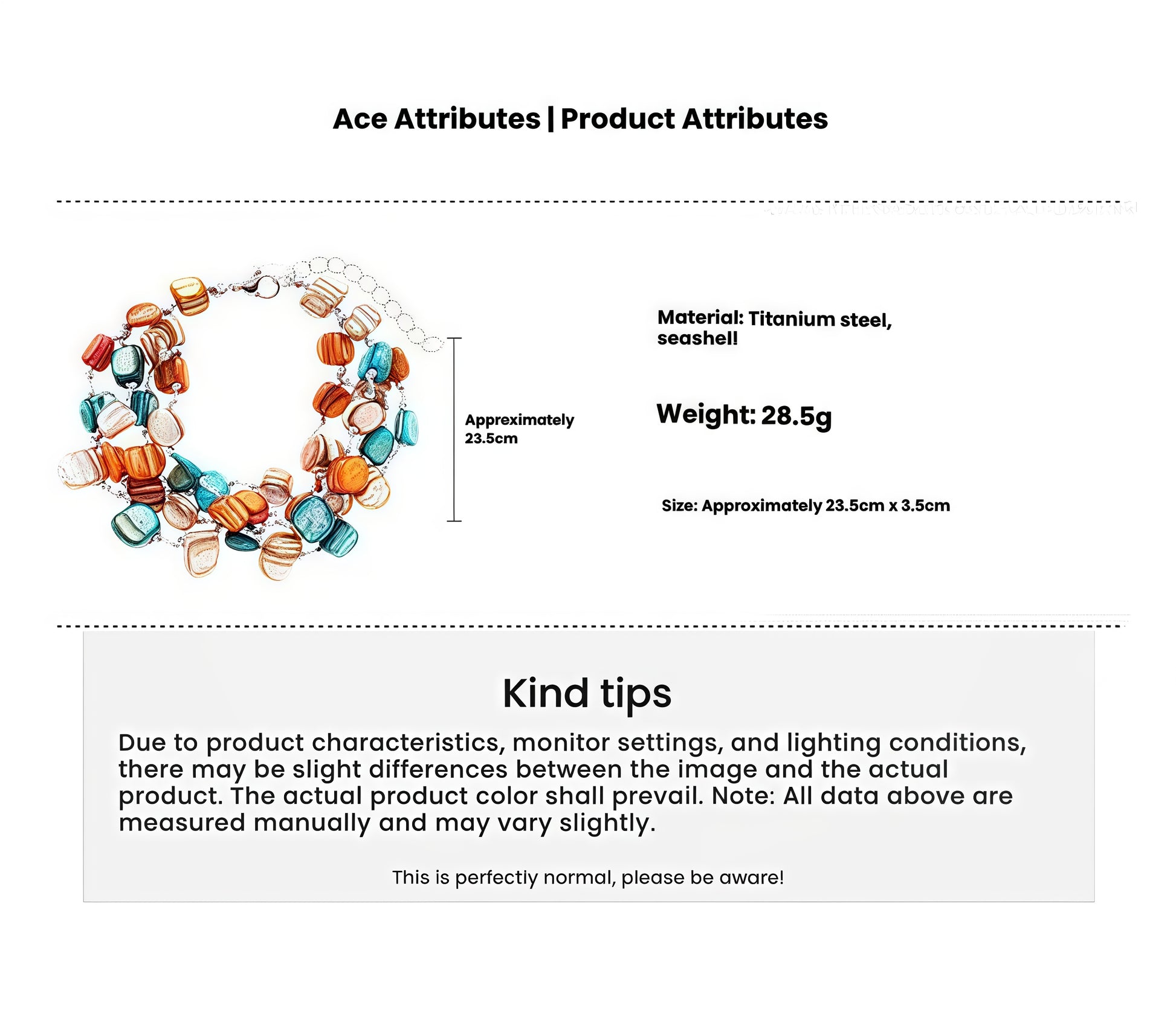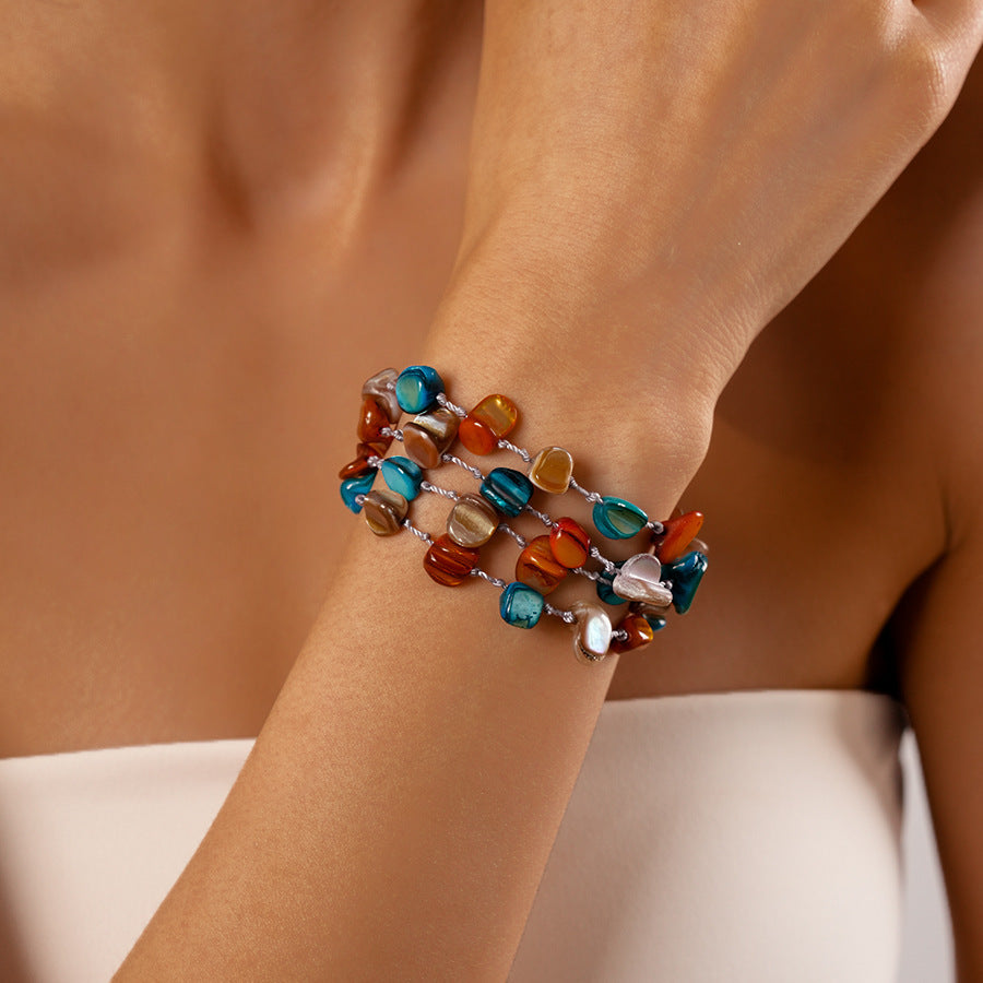 - Irregular shell chips on several strands create a full, eye-catching wrap without feeling bulky.