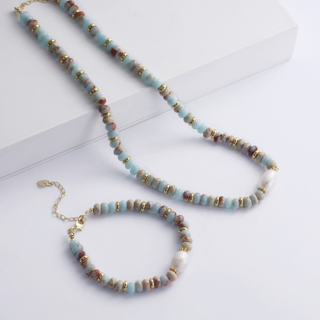 - Small rondelle Shoushan stone beads combined with a single freshwater pearl and gold accents create a soft yet noticeable look.
